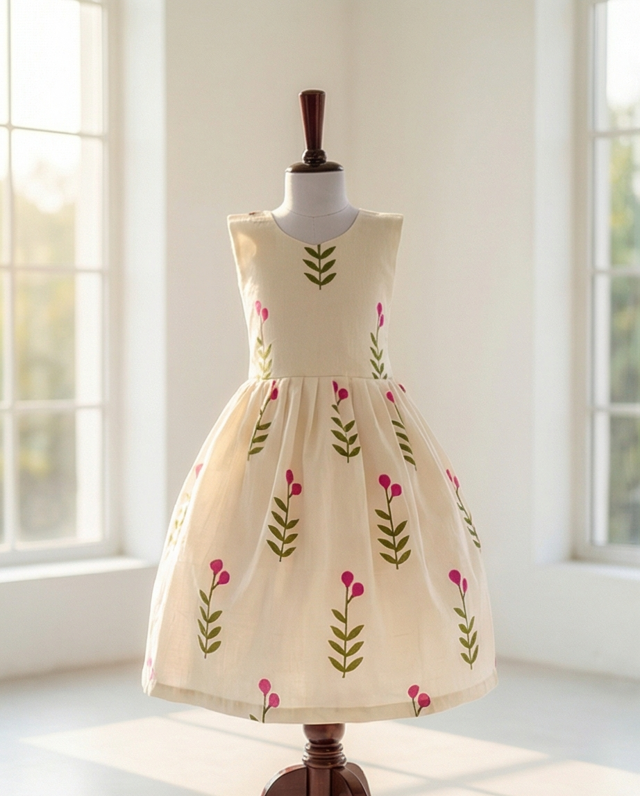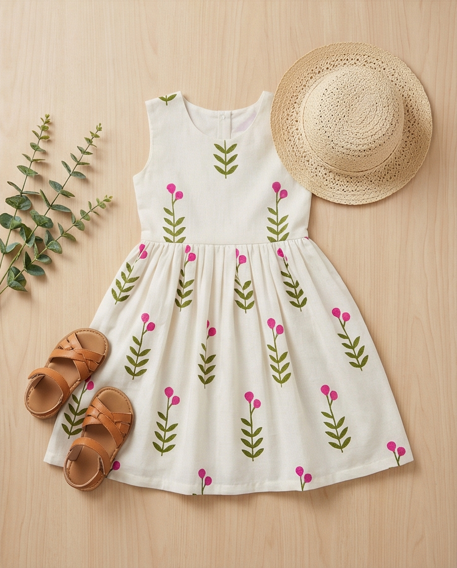 An effortless classic designed for all-day play. Crafted from 100% breathable cotton, this sleeveless dress keeps things cool and airy, whether she’s at a garden party or the playground. Featuring a timeless white polka-dot print on a deep navy base, it’s finished with a comfortable cinched waist and a flared skirt made for twirling.
